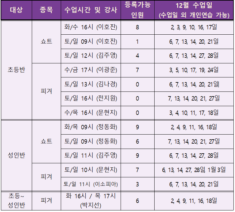 25년 12월 정규강습 신규등록 가능 인원 및 수업일정 안내