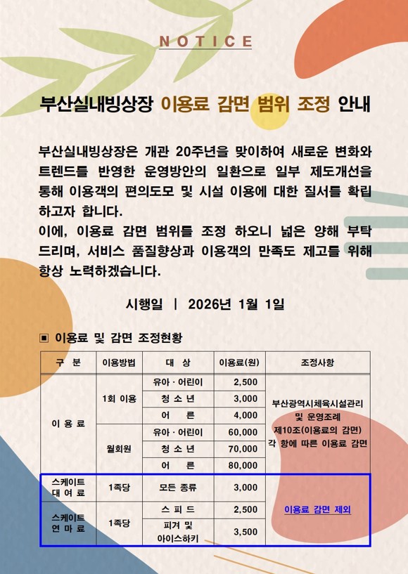 부산실내빙상장 이용료 감면 범위 조정 안내(2026.1.1부터 시행)
