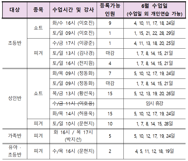 25년 6월 정규강습 신규등록 가능 인원 및 수업일정 안내