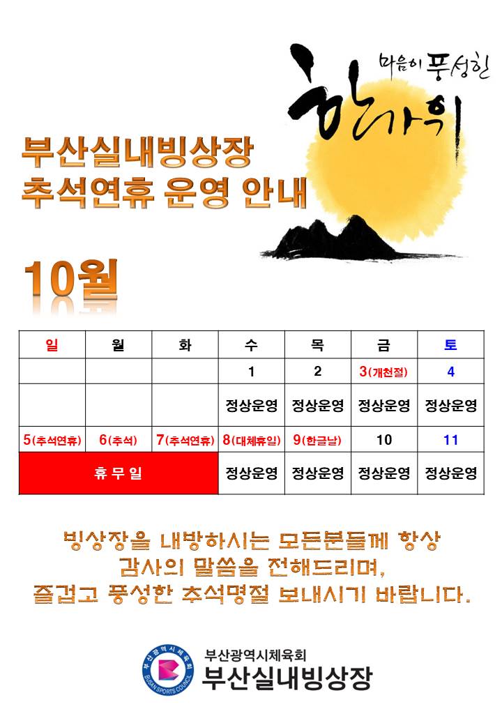 추석연휴 휴관(10/5~10/7) 안내